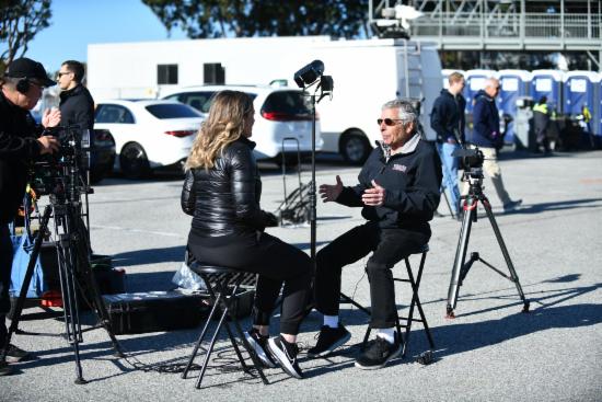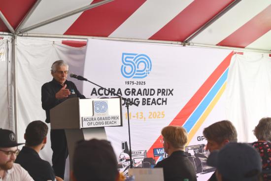 Jim Michaelian durante el monumental 50.º aniversario del Gran Premio de Long Beach platicando con los miembros de la prensa 10 de Abril del 2025.